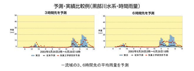 6時間後までの予測が可能なうえ、運動学的予測と物理的予測の合成により「予報の谷間」もカバーするので、精度の高い降雨予報を発信します。